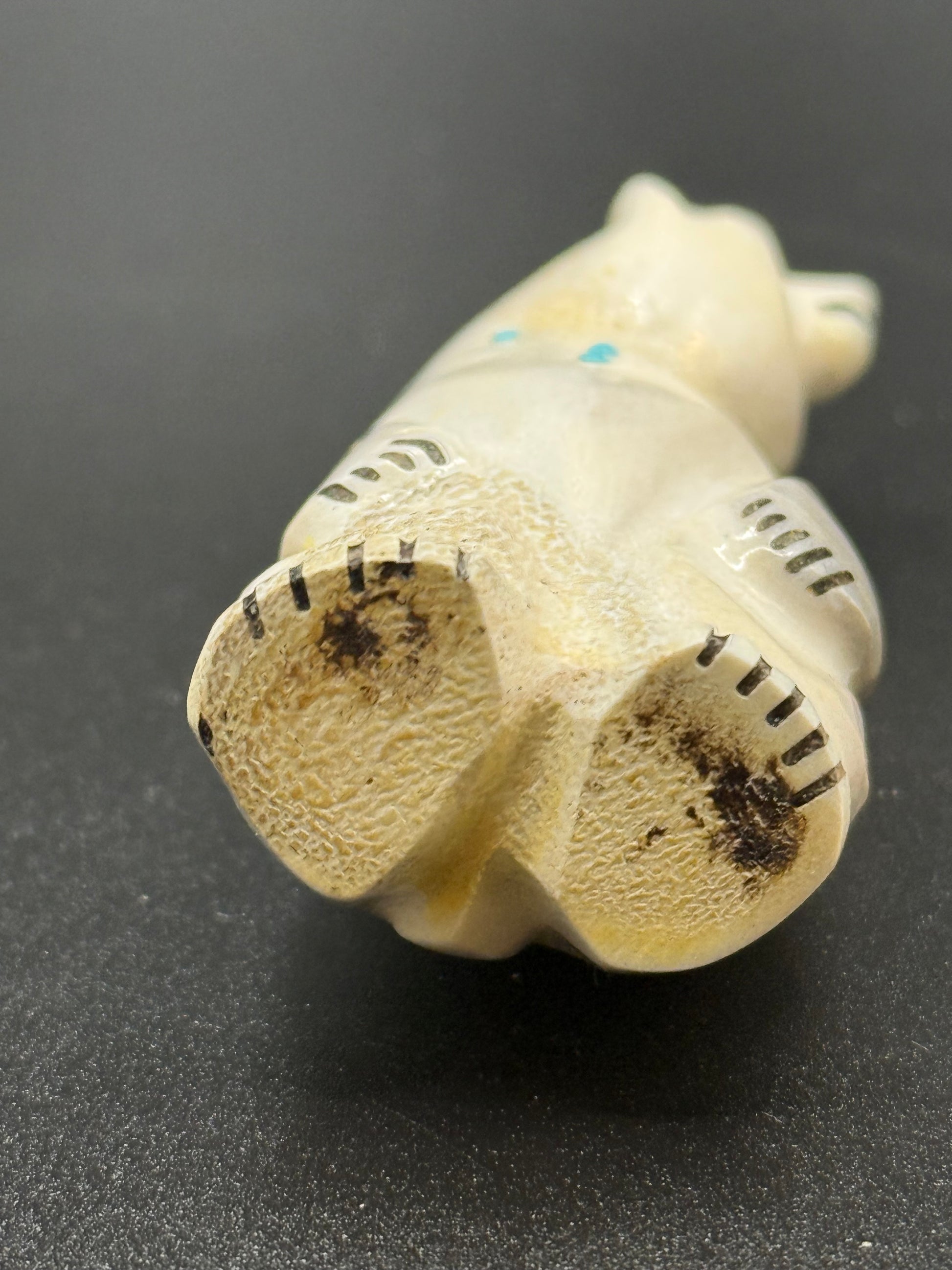 This smiling bear Zuni fetish was carved by Claudia Peina. The bottom is signed CPZ But fading