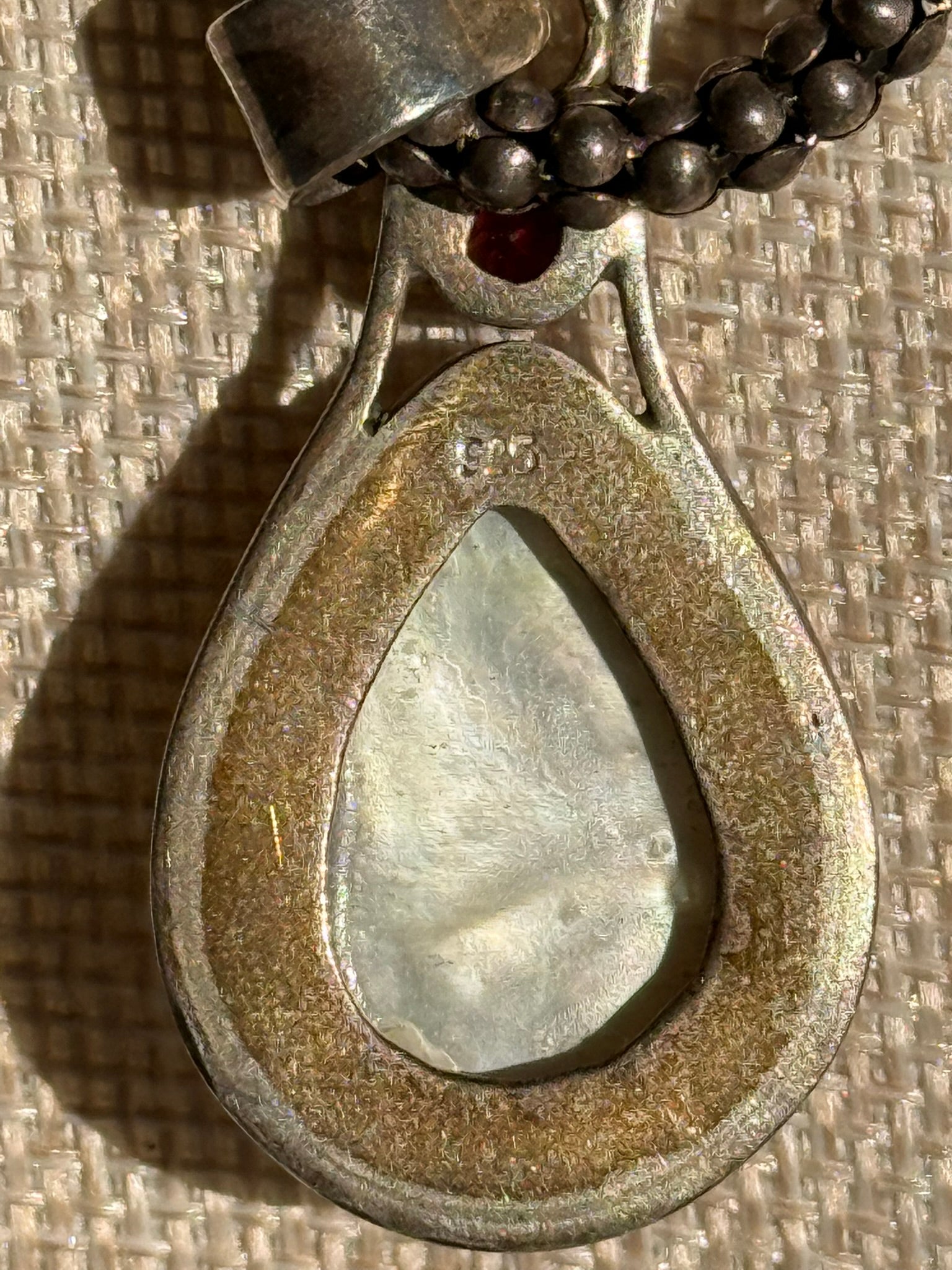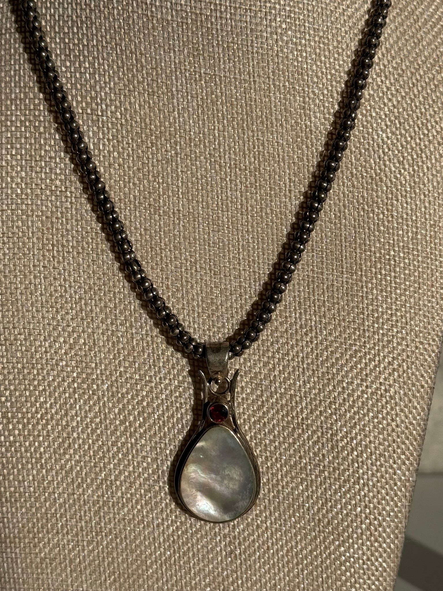 Beautiful Mother of Pearl and Ruby Pendant Wrapped in Sterling Silver on Chunky Sterling Chain