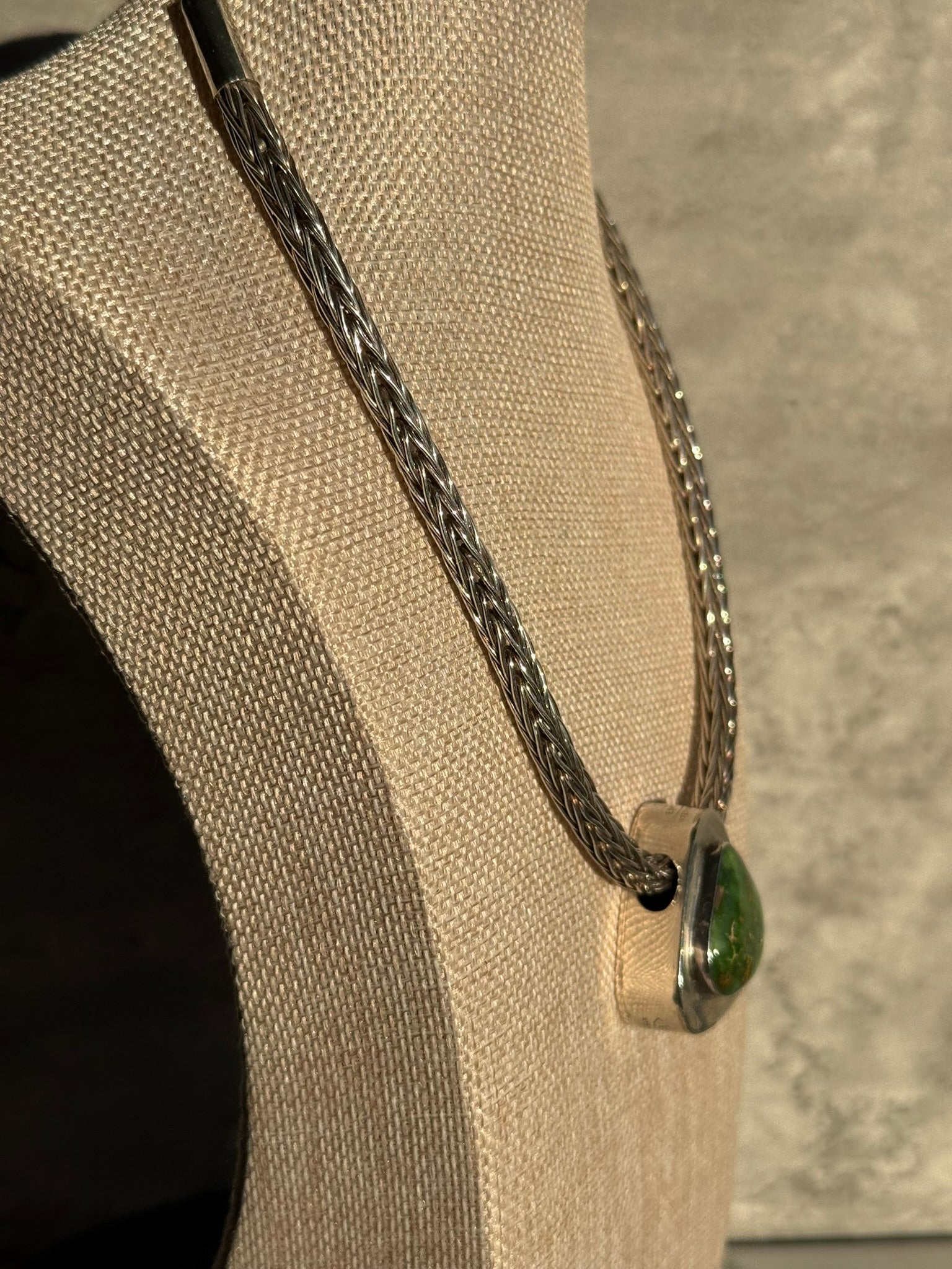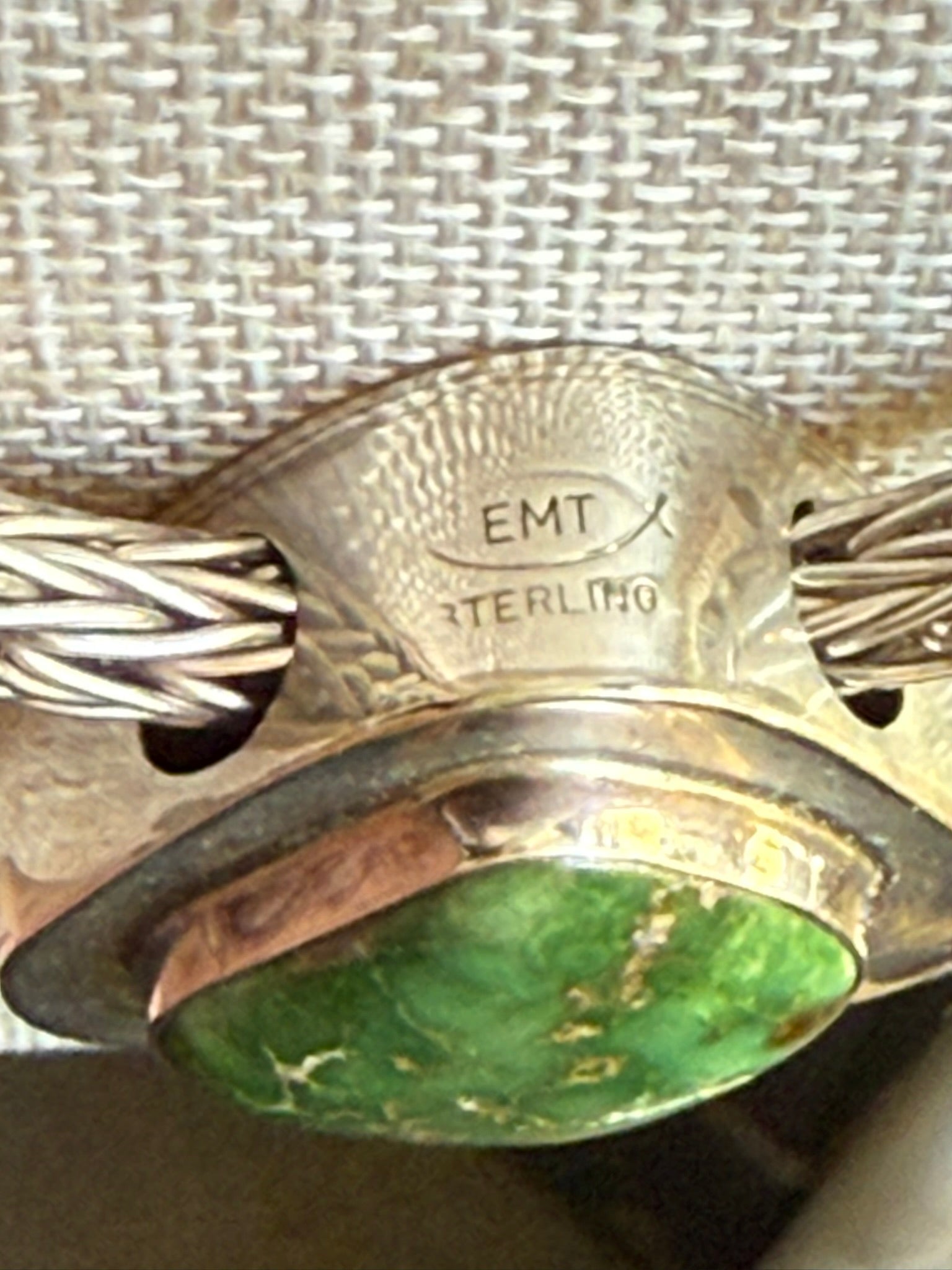 This extraordinary, collectible Native American necklace showcases the renowned craftsmanship of EMT (Everett and Mary Teller). Featuring a stunning grasshopper turquoise stone set in Sterling Silver , this handcrafted masterpiece is a testament to the rich heritage of Navajo artistry.