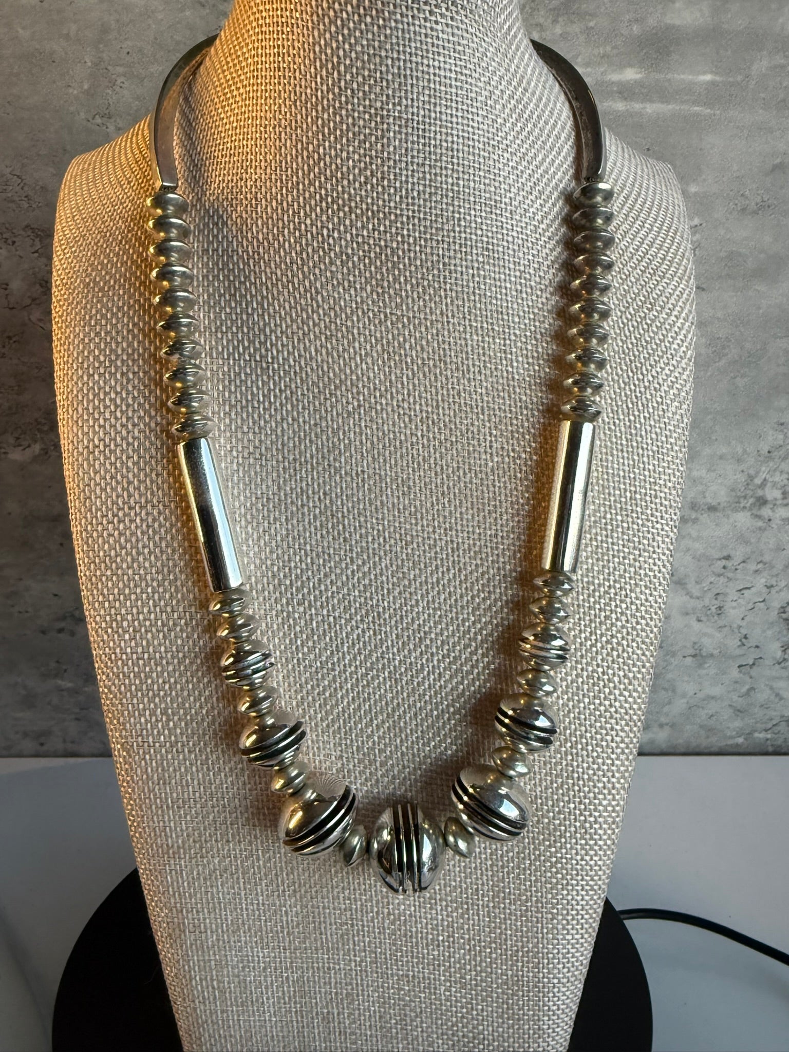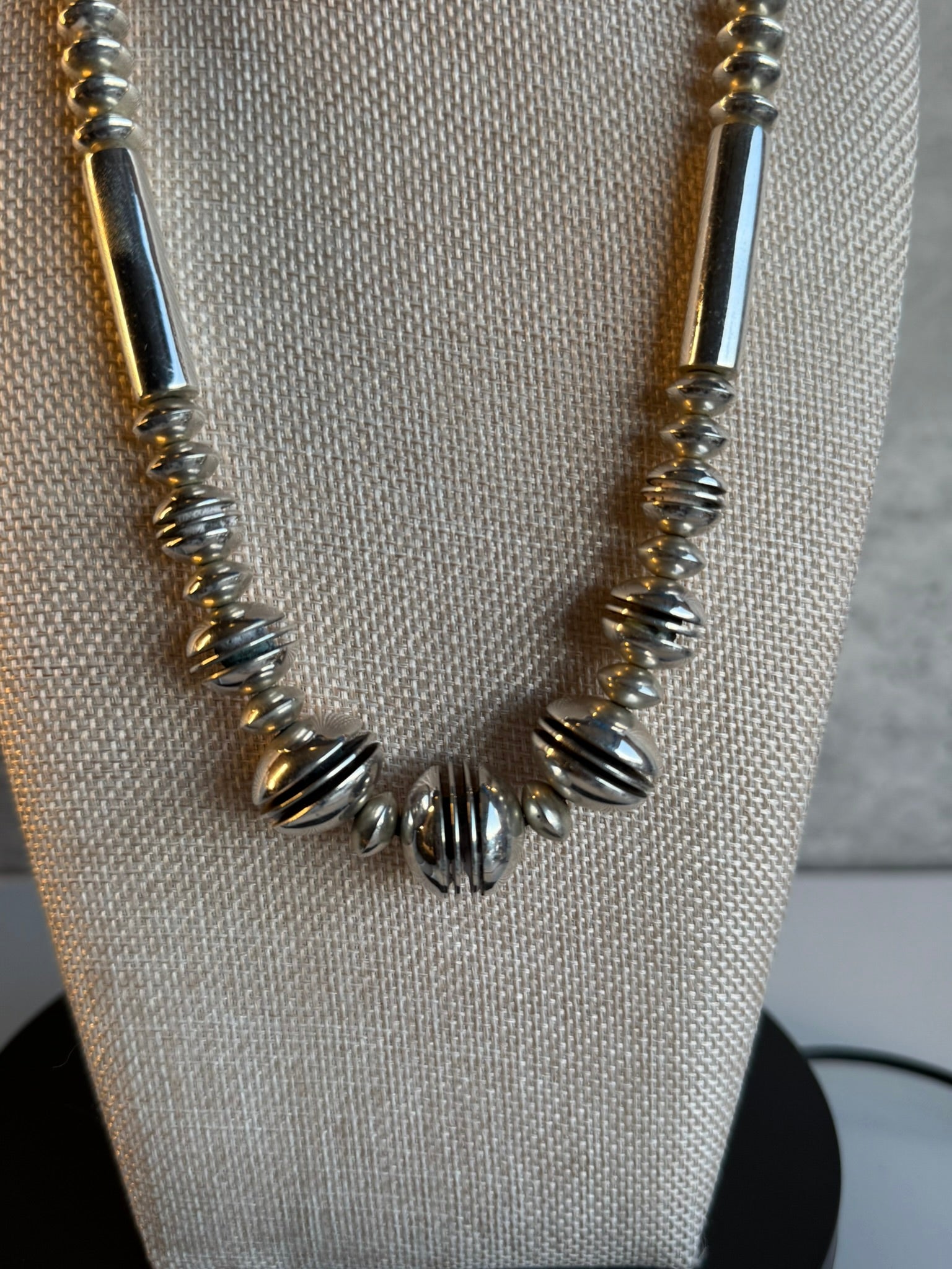 Navajo artist, Mike Thompson, made this beautiful sterling silver channel silver bead necklace . The silver bead necklace has 11 seamless silver spacer beads, 1 1/2" long tubular beads and 12mm square channel beads. The necklace has larger silver cones, hook with eye closure and is 17 1/2" in length. The necklace has a solid weight. .